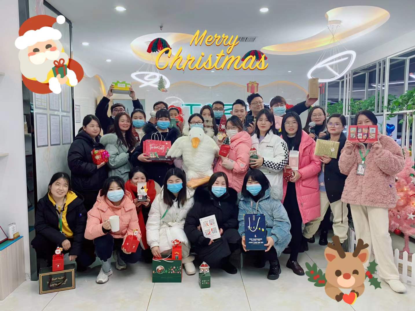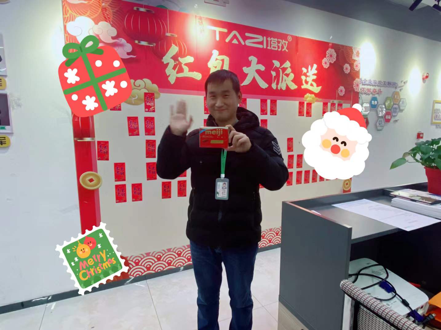 “圣誕老人趕著麋鹿,在平安夜晚上悄悄的光臨塔孜總部辦公室,為大家布置好充滿節(jié)日氛圍的辦公室,還為大家?guī)砹司臏蕚涞亩Y物。BUT!禮物太多了,所以圣誕老爺爺托我告訴大家,我們本次平安果由喬治發(fā)放給大家!”隨著主持人的開場詞,本次活動正式開始咯!