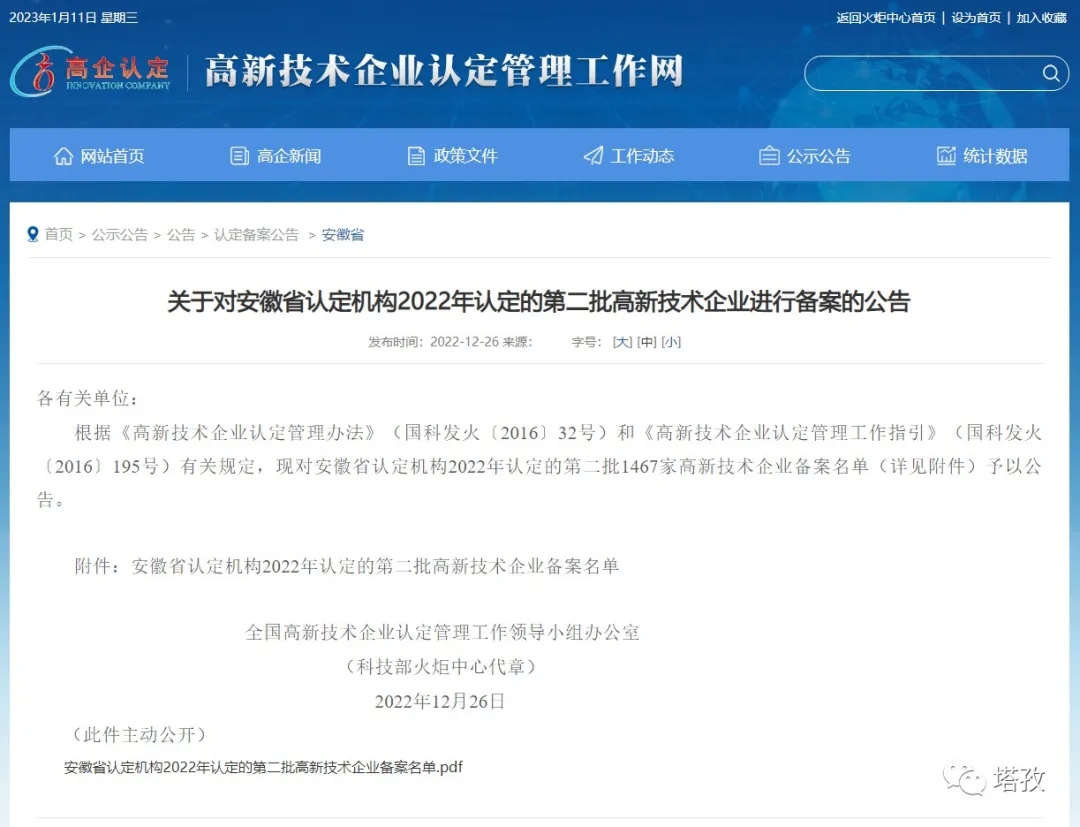 近日,全國高新技術(shù)企業(yè)認(rèn)定管理工作領(lǐng)導(dǎo)小組辦公室發(fā)布了《關(guān)于對安徽省認(rèn)定機(jī)構(gòu)2022年認(rèn)定的第二批高新技術(shù)企業(yè)進(jìn)行備案的公告》。經(jīng)專家評審,安徽塔孜信息技術(shù)有限公司(以下簡稱:塔孜科技)順利通過國家高新技術(shù)企業(yè)認(rèn)定,成功獲得“國家高新技術(shù)企業(yè)”稱號。