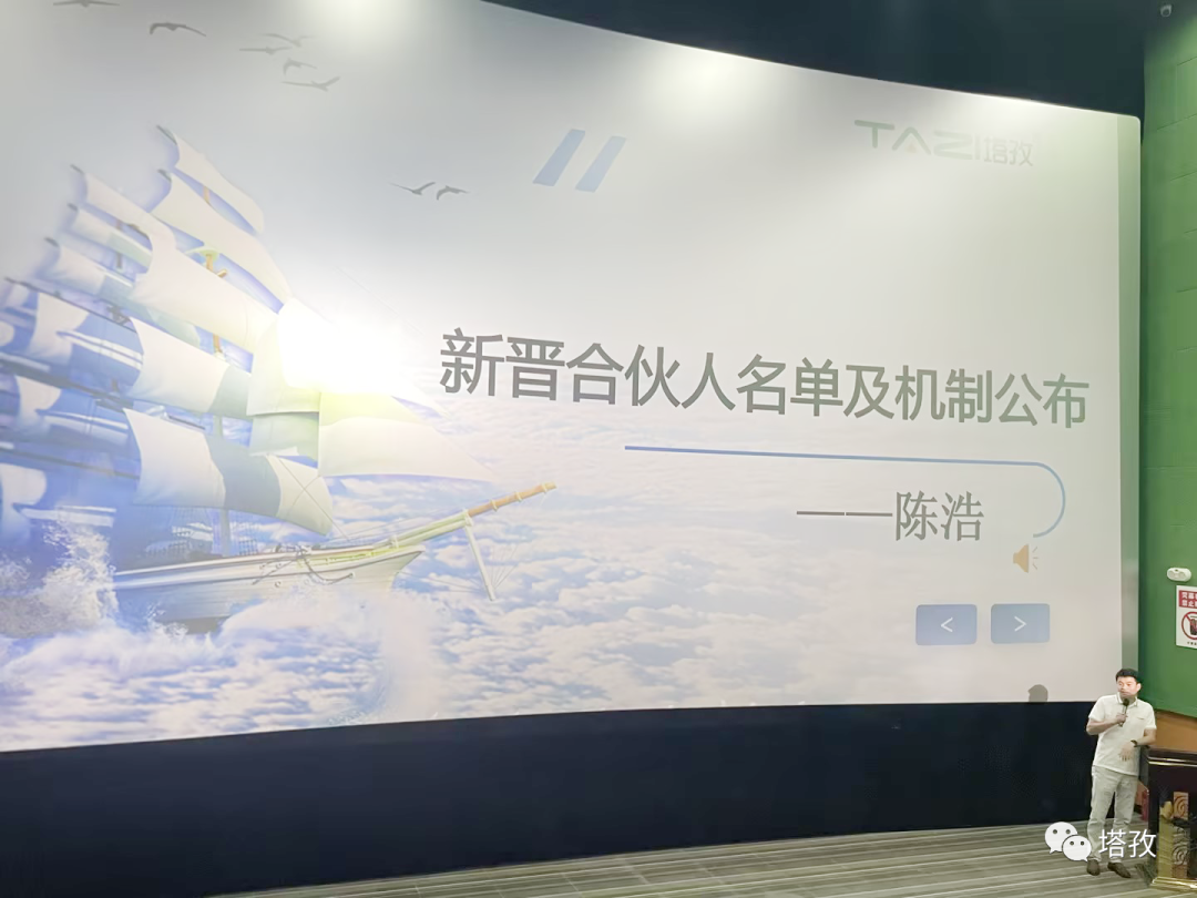 會(huì)上,塔孜聯(lián)合創(chuàng)始人陳浩先生做了集團(tuán)合伙人機(jī)制公布。合伙人機(jī)制是為了激勵(lì)核心員工與企業(yè)共成長,并分享公司發(fā)展和成長的利益來制定的分紅辦法。